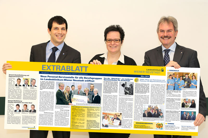 (v.l.) Mag. (FH) Markus Neuwirth, Barbara Fenz und Landesrat Mag. Karl Wilfing präsentieren stolz die Wandzeitung des Landesklinikums Wiener Neustadt.