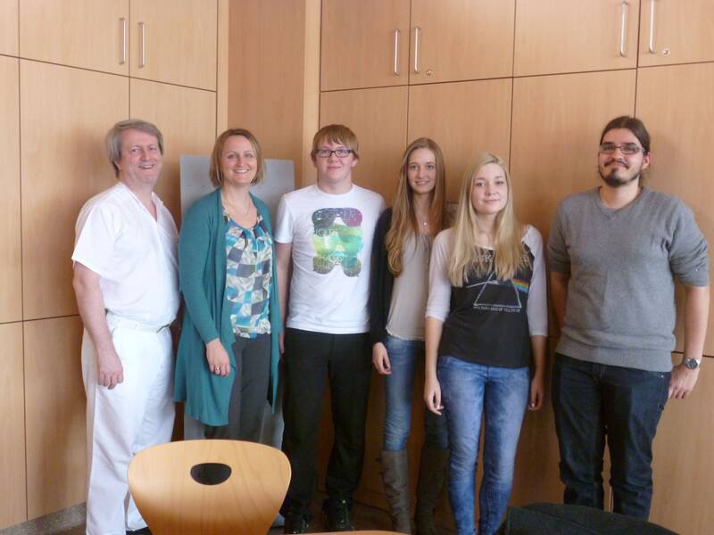 Ärztlicher Standortleiter Prim. Dr. Michael Böhm, stv. Regionalmanagerin Mag. Karin Platz und Turnusärztevertreter Dr. Stefan Berger (ganz rechts) mit den interessierten Schülern Matthias Kowarsch, Sonja Spindler und Franziska Vischer