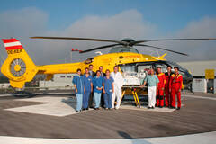(v.l.) DKKS Alexandra Kerschbaum, OÄ Dr. Ulrike Greibich, Mag. Dr. Bernhard Kadlec, Kaufmännischer Direktor, DKKS Ilse Stadler, Ing. Christian Müllner, MSc, Technischer Leiter, OÄ Dr. Ursula Schneider; Prim. Univ.-Prof. Dr. Karl Zwiauer, Leiter der Kinder- und Jugendabteilung, Prim. Univ.-Prof. Dr. Christoph Hörmann, Leiter Anästhesiologie und Intensivmedizin, Cpt. Günter Grassinger (Pilot/Stützpunktleiter C2), OA Dr. Martin Klezl (Anästhesie LK Krems) und HCM Jürgen Pfeiffer (RK Krems)