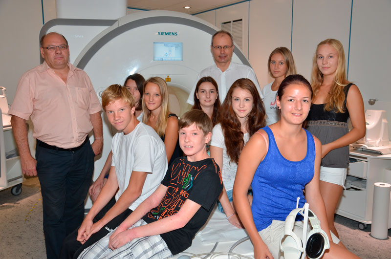(v.l.) Dipl.-KH-BW Karl Busta (Stv. Kaufmännischer Direktor), die Teilnehmerinnen und Teilnehmer der Jugend-Uni, Prim. Univ.-Prof. Dr. Martin Breitenseher (Leiter des Instituts für Radiologie und interventionelle Radiologie)