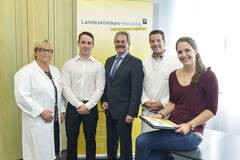(v.l.) Dr. Karin Hammer, Oberärztin an der Abteilung für Radioonkologie und Strahlentherapie Landesklinikum Wiener Neustadt; Interessent Mirnes Bajric; Landesrat Mag. Karl Wilfing; Dr. Florian Hosiner, Turnusarzt am Universitätsklinikum Krems und Interessentin Viktoria Zwetzbacher