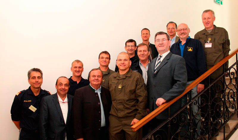 Bei einer Zwischenbesprechung, zu der Bezirkshauptmann WHR Dr. Gerhard Schütt (1. Reihe, 3.v.r.) einlud, konnten sich die Leiter der an der Übung beteiligten Organisationen über den Verlauf informieren, ebenso wie der Kommandant der Betriebsfeuerwehr OBI Manfred Koch und Primar Dr. Friedrich Marian als Bezirksarzt des Roten Kreuzes (3. und 2. v.l.).