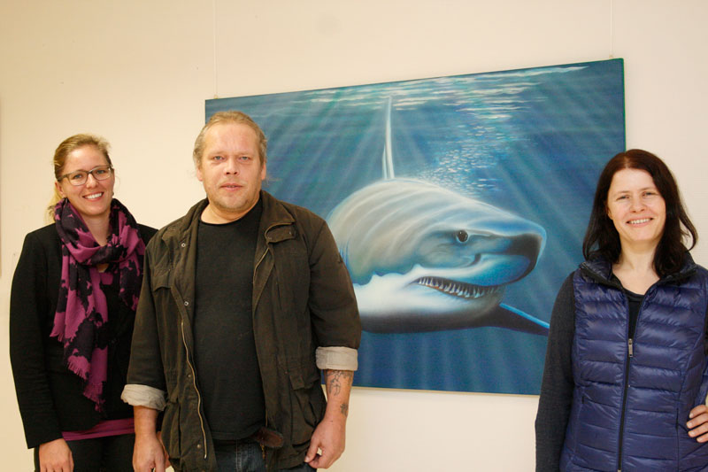 Kaufm. Standortleiterin Mag. Gabriele Kernstock und Ergotherapeutin Franziska Allram mit dem Künstler Hannes Gererstorfer