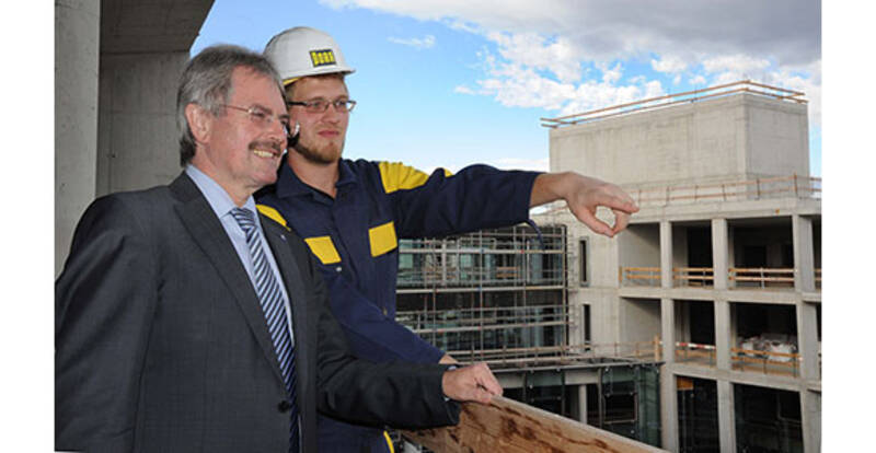Landesrat Mag. Karl Wilfing mit Christopher Heitzer bei der Dachgleiche im Landesklinikum Neunkirchen