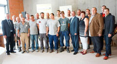 Landtagsabgeordneter Anton Kasser (1.v.l.), Mitarbeiter der Fa. Pabst, Landesrat Mag. Karl Wilfing (7.v.r.), Landtagsabgeordnete Michaela Hinterholzer (5.v.r.), Bau- Zimmermeister Ing. Franz Pabst (3.v.r.), Ing. Jürgen Lehenbauer (2.v.r.), BM Dipl.-Ing. Thomas Gröbinger (1.v.r.)