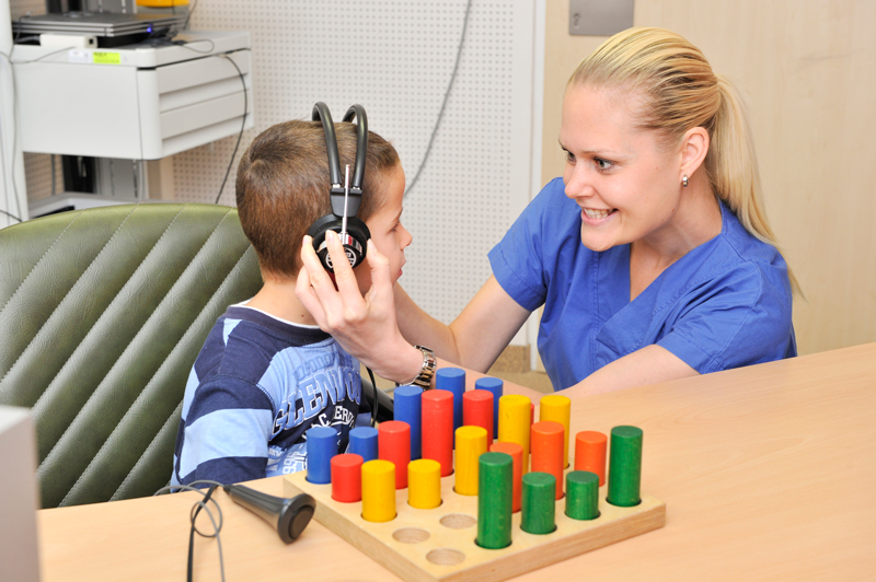 Logopädin Silvia Kienast, HNO-Abteilung, im Rahmen einer audiologischen Untersuchung bei einem Kind