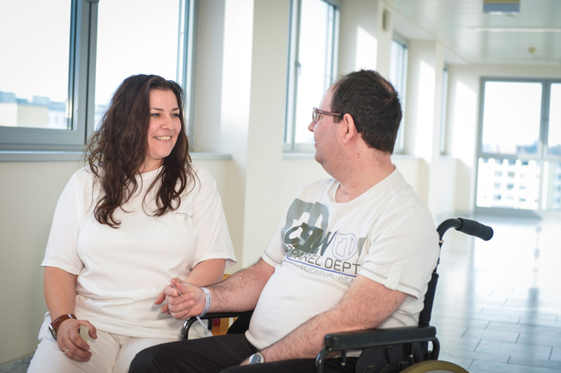 Logopädin Anna Glück-Aschauer, Abteilung für Neurologie, mit einem Patienten bei einer logopädischen Sprachtherapie