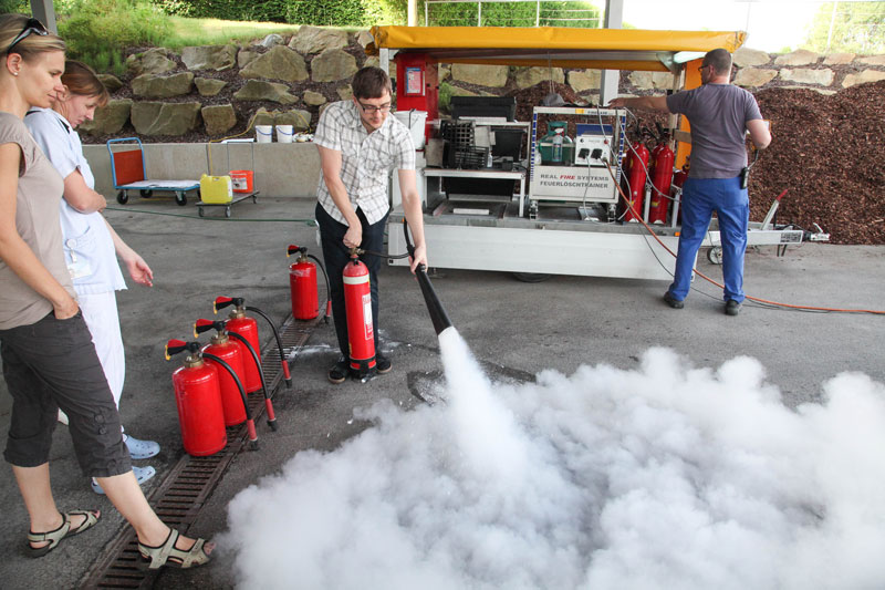 Nach einer theoretischen Einführung und Wiederholung der bereits bei den letzten Übungen vermittelten Inhalte wurde mithilfe des Brandsimulators der NÖ Landeskliniken Holding unter professioneller Aufsicht des Brandschutzbeauftragten das Feuer entfacht. Die Mitarbeiter des Landesklinikums - alle Bediensteten sind in der ordnungsgemäßen Handhabung der verschiedenen Löschgeräte verpflichtend zu unterweisen – mussten nun den Feuerlöscher richtig bedienen und einen brennenden Papierkorb löschen.