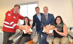 (v.l.) Josef Schmoll (Präsident Rotes Kreuz Niederösterreich), Blutspenderin Ingrid Enne, Testimonial Benjamin Raich, Landesrat Mag. Karl Wilfing und Blutspenderin Jennifer Bieder; Copyright: NLK/Pfeiffer