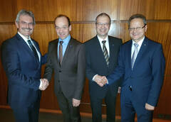 Gratulation zum neuen Vorsitz und Vorsitz-Stellvertreter der ARGE wirtschaftliche Leiter: (v.l.) Landesrat Mag. Karl Wilfing, Mag. Franz Huber (Kaufmännischer Direktor des LK Horn-Allentsteig und LK Gmünd-Waidhofen/Thaya-Zwettl), Dipl. KH-BW Anton Hörth (Kaufmännischer Direktor LK Korneuburg-Stockerau), Dipl. KH-BW Helmut Krenn (Kaufmännischer Geschäftsführer NÖ Landeskliniken-Holding)