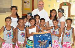 Als kleines Dankeschön für die langjährige Kooperation und die diesjährigen Untersuchungen überreichten die saharauischen Kinder zusammen mit Betreuerin Hasina Selma Mohamed Prim. Univ.-Doz. Dr. Johann Pidlich, Ärztlicher Direktor LK Baden-Mödling, einen handgewebten Teppich.