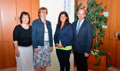 Begrüßten die Referentin im Landesklinikum Horn: (v.l.) Sabine Neunteufl (Betriebsrat), Eva Lampeitl (Stabstelle Marketing & Projekte Landesklinikum Horn), Christine Hackl, Mag. Franz Huber (Kaufmännischer Direktor)