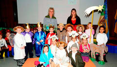 (v.l.) 1. Reihe: (Maria, Jesus und Josef) Elisa, Felix, Maximilian, 2. Reihe: (Schafe) Finn, Anna, Sophie, 3. Reihe: (Engel, Hirten und Könige) Tobias, Jakob, Ben, Björn, Lukas, Antonia, Lea, Stefanie, Victoria, 4. Reihe: (Leitung und Gruppenleiterin) Brigitte Szukits und Yvonne Eipeldauer