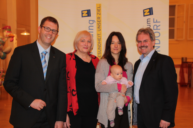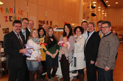 Beim 3. Mistelbacher Babytag: Prim. Priv. Doz. Dr. Felix Stonek, MBA, Regionalmanager Weinviertel DI Jürgen Tiefenbacher, Prim. Dr. Jutta Falger, MBA, MSc, Stv. Ärztlicher Direktor Prim. Dr. Wolfgang Pichler, MAS, Landesrat Mag. Karl Wilfing, Pflegedirektor DGKP Josef L. Strobl, akad. PD, Bereichsleiterin DGKS Monika Pichler, MBA, Ärztlicher Direktor Prim. Univ. Doz. Dr. Otto Traindl, Bezirkshauptmann Mag. Verena Sonnleitner, Mistelbachs Bürgermeister Dr. Alfred Pohl und Mistelbachs Stadtmarketing Geschäftsführer Erich Fasching (v.l.).