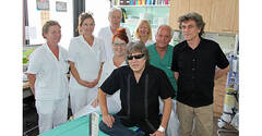 José Feliciano mit Manager Helmuth Schärf und (v.l.) DGKS Karin Konas, DGKS Irene Izso, OA Dr. Kurt Pecoraro, DGKS Eliane Utner, DGKS Ingeborg Weil und OA Dr. Hermann Fellner