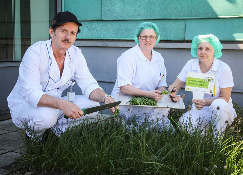 Als das Dach der Terrasse des Klinikums vor einigen Jahren begrünt wurde, entstand die Idee, diese Flächen unter anderem auch für Wildpflanzen und Kräuter zu nutzen. Da diese Flächen naturbelassen sind, wurde dem Landesklinikum Zwettl vor zwei Jahren die Auszeichnung „Natur im Garten“ vom Land NÖ verliehen. Ein gutes Beispiel ist der Schnittlauch, dieser wird frisch geerntet und in der Küche zur Verfeinerung der Speisen verwendet. Dies zeigt, wie man auch als Großbetrieb die Ressourcen des eigenen Gartens nützen kann.