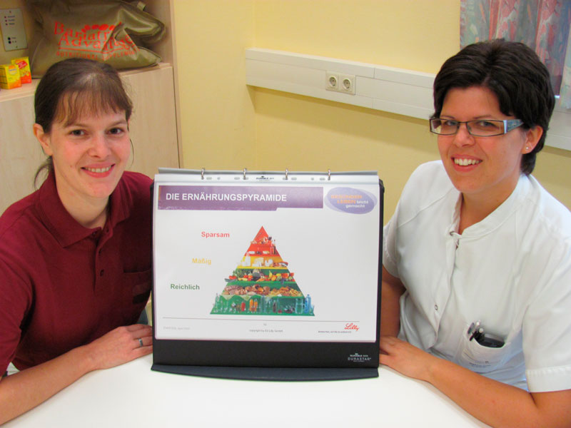 Die Einnahme mancher Medikamente kann eine Verlangsamung des Stoffwechsels bewirken, dies hat somit möglicherweise direkten Einfluss auf Gewichtsveränderungen. Während des Genesungsverlaufes von psychischen oder physischen Gebrechen und im Laufe eines Spitalsaufenthaltes kann oft die sportliche Betätigung nicht im notwendigen Ausmaß ausgeübt werden um körperlich fit zu bleiben. Um Gewichtsschwankungen weitgehend vorzubeugen, bieten die Diätologinnen mit Unterstützung des Pflegepersonals in der Sozialpsychiatrischen Tagesklinik am Landesklinikum Hollabrunn den Patientinnen und Patienten die Gelegenheit einer Ernährungsschulung an. Diätologin Claudia Kölbl erklärt dazu: „Die Patienten entscheiden individuell, ob sie dieses Angebot gerne in Anspruch nehmen möchten. Bei den adäquaten Schulungen, die vierzehntägig stattfinden, wird anhand der Ernährungspyramide erklärt, wie eine gesunde, ausgewogene Ernährung aufgebaut ist und wie sie diese im Alltag umsetzen können. Es werden aber auch Ernährungsmythen und aktuelle Themen besprochen.“ Mit Hilfe von Lebensmittelverpackungen lernen die Patienten, die Angaben von Eiweiß, Fett und Kohlenhydraten zu lesen, zu interpretieren und die ernährungsphysiologische Wertigkeit des Produktes richtig zu beurteilen. Claudia Kölbl, Diätologin am Landesklinikum Hollabrunn, ergänzt: „Auf ausdrücklichen Wunsch der einzelnen Patienten besteht auch die Möglichkeit zur Einzelberatung.“ In den Wochen zwischen den Ernährungsschulungen gibt es zusätzlich die Möglichkeit zur sportlichen Betätigung. Claudia Kitzler, diplomierte psychiatrische Krankenschwester an der Sozialpsychiatrischen Tagesklinik, dazu: „Wir bieten überdies abwechselnd zu den Ernährungsschulungen auch Nordic Walking und Bewegungsgruppen an, damit die Patienten der Sozialpsychiatrischen Tagesklinik ihre körperliche Fitness verbessern können. Auf einander abgestimmte ausgewogene Ernährung und ausreichende Bewegung haben maßgeblichen Einfluss auf den Genesungsverlauf.“ Dieses innovative Angebot der Sozialpsychiatrischen Tagesklinik am Landesklinikum Hollabrunn setzt zusätzlich neue Impulse hinsichtlich eines gesünderen Lebensstils.