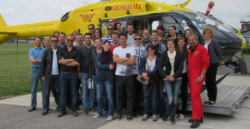 Die stolzen Absolventinnen und Absolventen des Notarztkurses besichtigten den Christophorus 3 am Gelände der Flugrettung des ÖAMTC (ganz rechts: Prim. Dr. Helmut Trimmel).