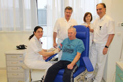 In den neuen, hellen Räumlichkeiten in Ebene 1 erfolgt nun die Blutabnahme des Instituts für Medizinisch-Chemische Labordiagnostik: BMA Doris Zangl, Ärztlicher Direktor Prim. Univ. Doz. Dr. Otto Traindl, Leitende BMA Ursula Harrach sowie der Leiter des Laborinstituts Prim. Dr. Harald Rubey (v.l.) mit Patient Franz Gindl.