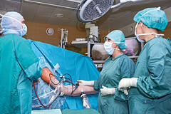 Die Operation an dem 43-Jährigen beginnt. Nachdem der erste kleine Schnitt am Patienten gemacht wurde, wird das Arthroskop ins Schultergelenk geführt. Nadja Kerschner bedient die Kamera, sodass Oberarzt Bockhorn beide Hände frei hat, um die gerissene Sehne zu behandeln. „Mir macht das Assistieren großen Spaß, weil es eine neue Herausforderung ist. Man bekommt einen ganz anderen Blickwinkel auf die Operation, weil man nicht durch andere Tätigkeiten abgelenkt wird“, erklärt Kerschner. Für diese Tätigkeiten ist die Instrumentar-Schwester zuständig: Sie reicht im richtigen Moment die richtigen Werkzeuge weiter.