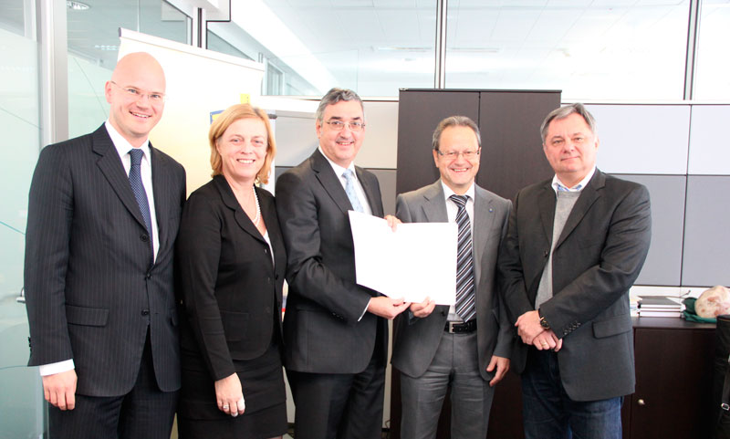 (v.l.) Kaufm. Dir. DI Franz Laback, MBA, Regionalmanagerin Christa Stelzmüller, MAS, Dipl. KH-BW Helmut Krenn, Kaufmännischer Geschäftsführer der NÖ Landeskliniken- Holding und Dr. Markus Klamminger, stv. Medizinischer Geschäftsführer der NÖ Landeskliniken-Holding gratulieren Prim. Dr. Heinz Jünger (Mitte) zur Ernennung als Ärztlicher Direktor des LK Krems.