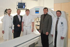 Prim. Dr. Winfried Strohmayr (3.v.l.) demonstriert (v.l.) Prim. Doz. Dr. Manfred Weissinger, Dr. Andreas Reifschneider, Dir. Robert Eberl und Dir. Franz Waldecker den neuen Computertomographen.