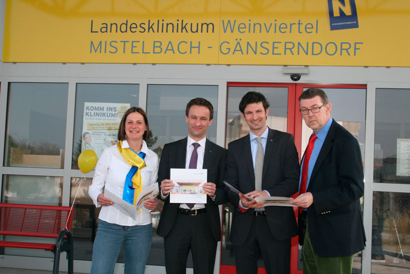 Beim Infotag „Komm ins Klinikum“ präsentierten Bereichsleiterin DGKS Tatjana Masa-Charvat, MSc, Regionalmanager DI Jürgen Tiefenbacher, LAbg. René Lobner und der medizinische Standortleiter Prim. Dr. Wolfgang Pichler, MAS (v.l.), erstmals den neuen Infofolder fürs Medizinische Zentrum Gänserndorf.