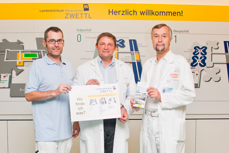 Sich in einem großen Gebäude zu orientieren und so auf den kürzesten Weg zum Ziel zu gelangen fällt nicht immer leicht. Schnell ist die Übersicht verloren und die Suche nach Hinweisen oder ortskundigen Personen beginnt. „Speziell unsere älteren Patientinnen und Patienten haben immer wieder Probleme mit der Orientierung im Landesklinikum Zwettl. Diese Rückmeldung bekommen wir immer wieder im Zuge der jährlichen Patientenbefragung“, erklärt der pflegerische Standortleiter Andreas P. Lausch, MAS, MBA, MSc. Als Reaktion auf diese Rückmeldungen wurde jetzt ein neuer Folder entwickelt, der der besseren Orientierung im Landesklinikum Zwettl dient. „Der Folder bildet das gesamte Landesklinikum Zwettl in allen drei Ebenen ab. Weiters sind alle für unsere Patientinnen und Patienten wichtigen Einrichtungen beschrieben“, erklärt Franz Waldecker, kaufmännischer Standortleiter stolz die neue Orientierungshilfe. „Dieser Folder wird zukünftig großzügig im gesamten Haus, bei allen Anmeldestellen und auf allen Abteilungen aufliegen. Ebenfalls ist er auf der Homepage des Landesklinikums Zwettl unter www.zwettl.lknoe.at jederzeit abrufbar. Damit bekommt jeder schnell und einfach Hilfe bei der Orientierung im Klinikum.“ Patientenzufriedenheit in allen organisatorischen und medizinischen Bereichen ist eine wichtige Grundlage für eine optimale medizinische Versorgung. „Dieser Folder ist ein weiterer wichtiger Teil zur Verbesserung der Servicequalität und zeigt, dass uns die Rückmeldungen unserer Patientinnen und Patienten äußerst wichtig sind“, freut sich Prim. Univ.-Doz. Dr. Manfred Weissinger, Ärztlicher Direktor über den gelungenen neuen Orientierungsplan.