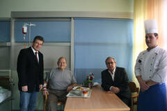 Pflegedirektor DGKP Josef L. Strobl, der Kaufmännische Direktor Dipl. KH-BW Josef Kober und Küchenleiter Peter Glaser (v.l.) erkundigten sich bei Willibald Wunsch über seine Zufriedenheit mit dem neuen Geschirrsystem.