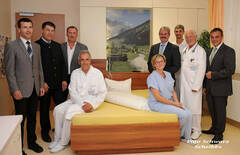 LR Mag. Karl Wilfing überzeugte sich vom besonderen Ambiente der beliebten Scheibbser Geburtenstation. v.l.n.r.: Kaufm. Direktor Mag. Klaus Watzinger, Regionalmanager Dr. Andreas Krauter, MBA, Betriebsrat Rudolf Zeller, sitzend Prim. Dr. Peter Diridl, ltd. Hebamme Elfriede König, LR Karl Wilfing, Bereichsleitung DGKP Alfred Kaltenbrunner, Ärztl. Direktor Prim. Dr. Friedrich Steger, LAbg. Anton Erber, MBA