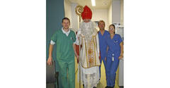 Der Nikolaus besuchte auch die Mitarbeiterinnen und Mitarbeiter der Überwachungsstation. (v.l.) DGKP Johannes Grissenberger, Nikolaus Franz Mayrhofer, DGKP Armir Mesic, DGKS Brigitte Teufl