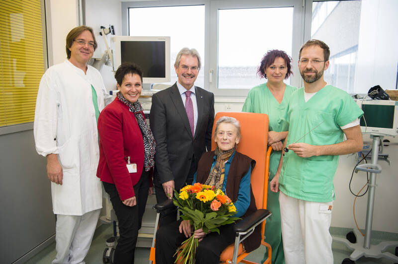 (v.l.) Prim. Dr. Martin Wiesholzer, Leiter der Klinischen Abteilung für Innere Medizin 1 am Universitätsklinikum St. Pölten, Bianca Hauer, Stv. Pflegedirektorin, Landesrat Mag. Karl Wilfing, Patientin Maria Groissenberger aus Kilb, DGKS Michaela Mittelstrasser, Koordinatorin Peritonealdialyse und OA Dr. Bernhard Kirsch