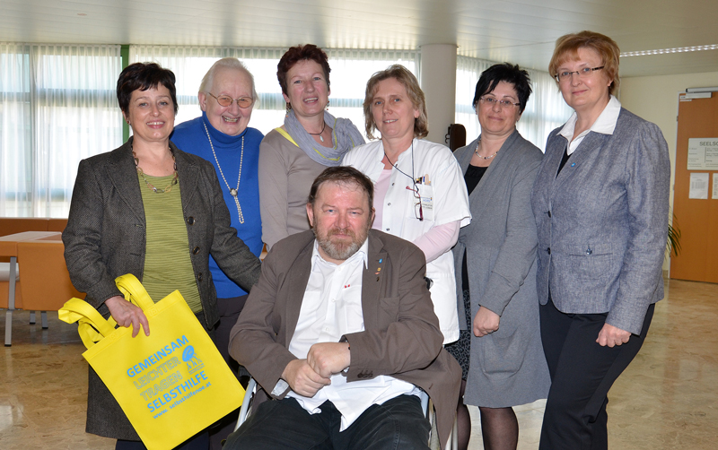 (v.l.) sitzend: Manfred Beck (Selbsthilfe für Patienten mit Hirnblutung und deren Angehörige). Stehend: Mag. Renate Gamsjäger (Dachverband der NÖ Selbsthilfegruppen), Angela Schichter (Diabetiker NÖ), Christa Daniel (Verein ICH bin ICH), Lieselotte Judmann (Entlassungsmanagerin LK Horn), Eva Nendwich (Sekretariat Pflegedienstleitung), Gerda Erdner (Horner Stadträtin)