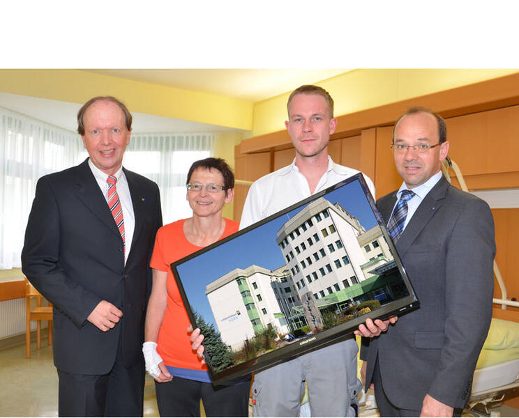 Bei der Installation eines neuen Flachbildfernsehers in einem der Patientenzimmer: Dr. Andreas Reifschneider (Regionalmanager Waldviertel), Patientin Waltraud Haller, Werner Wolf (Haustechnik), Mag. Franz Huber (Kaufm. Direktor Landesklinikum Horn-Allentsteig)