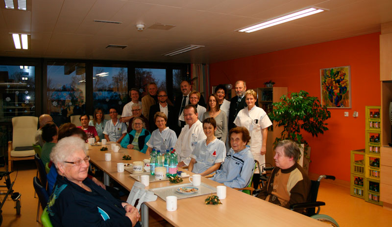 Patientinnen und Patienten Rosa Fahner, Gertrude Haumer, Maria Morscher, Theresie Haneder, Maria Renk, Angela Hahn, Charlotte Kurzmann, Otto Bäuchl, Gerhard Moldaschl und Hermann Kurzmann feiern gemeinsam mit Bgm. Andreas Beer, MA, Vbgm. Mag. Gottfried Libowitzky, Str. Michael Bierbach, Prim. Dr. Peter Kellner, Prim. Dr. Christa Menner, Prim. Dr. Michael Böhm, Dipl. KH-BW Karl Binder, Herta Weissensteiner, MBA, Dr. Julia Dlask, DGKS Elisabeth Hofmann, DGKS Sabine Oberbauer, DGKS Michaela Volkmann, DGKS Heidemarie Schalko und DGKS Elisabeth Flicker
