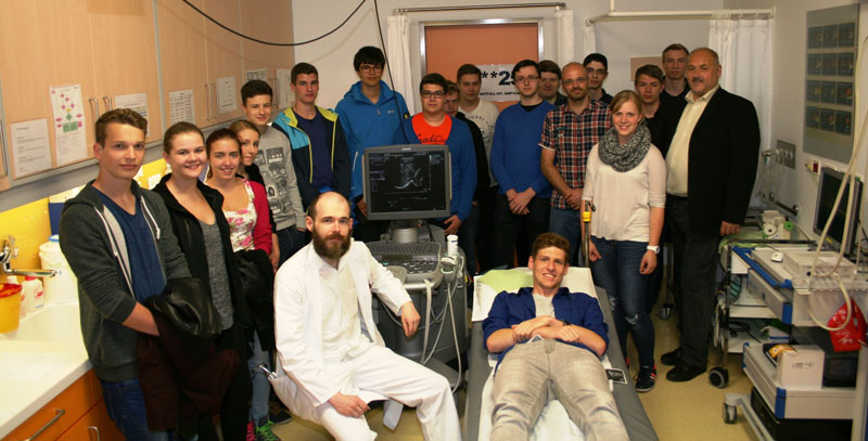 Nach einem kurzen allgemeinen Überblick durch den Kaufmännischen Standortleiter Dipl. KH-BW Karl Binder demonstrierte Ass. Dr. Michael-Patrick Müller, der vor seinem Medizinstudium auch Physik studiert hat, eine Ultraschalluntersuchung in der Internen Ambulanz. Dr. Müller wies die interessierten Schülerinnen und Schüler auf die Vorzüge und physikalischen Grundlagen dieser Art der Untersuchungsmöglichkeit hin. Der große Vorteil bei Ultraschalluntersuchungen besteht darin, dass die Patientinnen und Patienten keinerlei Strahlenbelastung ausgesetzt sind, und trotzdem sehr rasch eine genaue Diagnose möglich ist.
