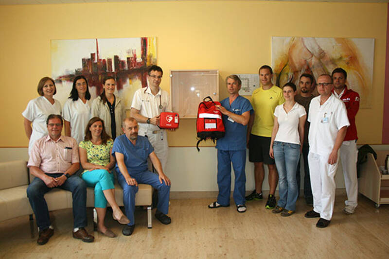Mit Abschluss der Umbauarbeiten konnten jetzt auch auf allen Stationen Kästen mit jeweils einem Notfallrucksack und einem automatischen Defibrillator angebracht werden.