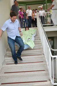 (v.l.) Franz Stöger (Branschutzsachverständiger), Mag. Franz Huber (Kaufmännischer Direktor LK Horn-Allentsteig), Norbert Kapeller (Brandschutzsachverständiger), Prim. Dr. Friedrich König (Ärztlicher Standortleiter Landesklinikum Waidhofen/Th.), Dipl.-Kfm. Ing. Heinz Eichwalder (Technischer Leiter Landesklinikum Horn). Ass. Dr. Johannes Küssel (LK Horn-Allentsteig Projektleiter Gefahrenabwehrhandbuch) bei praktischer Übung „Bergen mit dem Bergetuch“ (im Bergetuch Angelika Honas, Logopädin LK Horn); li. hinten Franz Stöger (Brandschutzschsachverständiger) und weitere Seminarteilnehmer.