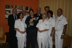 Das 600. Baby 2014: (v.l.) Bgm. Josef Zeitelhofer, leitende Heb. Ingrid Nedelik, OA Dr. Wiliam Loksa, die glückliche Mutter Fr. Andrea Kovacicova mit Nikolas im Arm, Kaufm. Dir. KH BW Wolfgang Palatinus, Stationsleitung Geburtshilfe DGKKS Elisabeth Trunner Abteilungsvorstand Prim. Dr. Gottfried Gamperl, Pflegedirektorin Bettina Riedmayer, Ärztl. Dir. Dr. Lukas Koppensteiner
