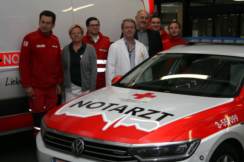 In der Rettungshalle des Landesklinikums Gmünd: (v.l.) Notarzt Dr. Jaroslaw Jazdzyk, Pflegestandortleiterin Herta Weissensteiner, MBA, Rettungssanitäter Lukas Machthuber, Ärztlicher Standortleiter und Leitender Notarzt Prim. Dr. Michael Böhm, Kaufmännischer Standortleiter Dipl. KH-BW Karl Binder, Rettungssanitäter Lucas Simon und Notfallsanitäter Christoph Schattauer-Schmidt