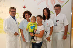 Leon Bogenstorfer hat sich gut entwickelt. Im Bild mit Mama Romana Schweinberger, der Leiterin der Abteilung für Kinder- und Jugendheilkunde und Neonatologie, Prim. Dr. Jutta Falger, MSc, MBA, der Stationsleitung der Abteilung für Kinder- und Jugendheilkunde und Neonatologie DKKS Jutta Bacher sowie Pflegedirektor DGKP Josef L. Strobl, akad. PD und dem ärztlichen Direktor Prim. Univ.-Doz. Dr. Otto Traindl