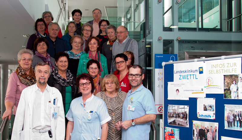 Prim. Univ.-Doz. Dr. Manfred Weissinger, DGKS Andrea Zottl, DGKS Lucia Burger MSc, Andreas Lausch MAS, MSc, MBA und Gertraud Preleuthner mit den Vertretern der Selbsthilfegruppen: Ferdinand Astleitner, Rosina Bischof, Marina Böhm, Isabella Buxbaum, Eva Fichtinger, Brigitte Gruber, Adolf Haider, Waltraud Haider, Sabina Köck, Josefa Koller, Robert Koller, Ernestine Kugler, Gertrude Mühlöcker, Martina Pauer, Helga Pfriemer, Helga Schmutz, Christine Weber