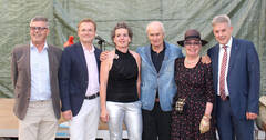 (v.l.) Kaufmännischer Direktor Dipl. KH-BW Ferdinand Zecha, Ärztlicher Direktor und Abteilungsvorstand der Neurologie Prim. Univ.-Prof. Dr. Peter Schnider, Pflegedirektorin Christa Grosz, MBA, Prof. Dr. Roland Girtler, Initiatorin des 1. Sommertheaters Dr. Erika Sieder, Landtagsabgeordneter Hermann Hauer