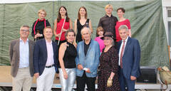 (v.l.) 1. Reihe: Kaufmännischer Direktor Dipl. KH-BW, Ärztlicher Direktor und Abteilungsvorstand der Neurologie Prim. Univ.-Prof. Dr. Peter Schnider, Pflegedirektorin Christa Grosz, MBA, Prof. Dr. Roland Girtler, Initiatorin des 1. Sommertheaters Dr. Erika Sieder, Landtagsabgeordneter Hermann Hauer; 2. Reihe: Una Hüttner, Alexandra Schoppelt, Petra Tengler, Stefan Zikoudis und Katharina Hobik (mit ihrer Tochter) vom Musikensemble