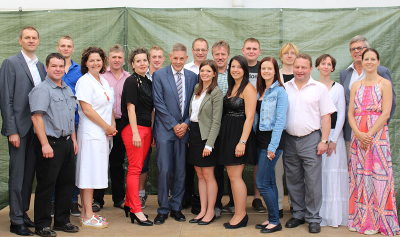 li außen Regionalmanager DI Alfred Zens, 6 von links Pflegedirektorin Christa Grosz, MBA, neben Landtagsabgeordneter Hermann Hauer, 11. von links Bürgermeister der Marktgemeinde Grimmenstein Engelbert Pichler, 2. von rechts Kaufmännischer Direktor Dipl.KH-Bw Ferdinand Zecha