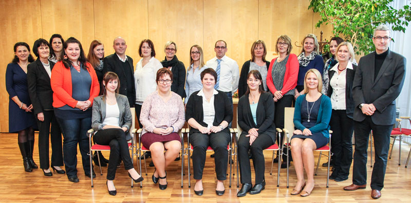 (v.l.) Sitzend: Nicole Kainz, Sonja Strohmayer Dangl, Sandra Ritter, Brigitte Pascher, Andrea Haumer; stehend: Claudia Wilhelm, Direktorin Hermine Mayerhofer, Anita Hauer, BSc, Marina Lehenbauer, MSc, Bettina Lackner, Mag. Jakob Fallmann, Monika Welser, Barbara Huber, Marianne Hackl, BSc, Christian Prinz, Claudia Neuwirth, Doris Bogg, Edith Schulmeister, stv. Dir. Mag. Dr. Martina Grubmüller, Anna Traxler, Prim. Univ.-Prof. Dr. Michael Hirschl, MSc