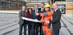 Gleichenfeier Haus C, Universitätsklinikum St. Pölten: (v.l.) Dipl. KH-BW Helmut Krenn, Kaufmännischer Geschäftsführer der NÖ Landeskliniken-Holding, Pflegedirektorin PhDr. Michaela Gansch, MSc, Landesrat Mag. Karl Wilfing, Kaufmännischer Direktor Mag. Dr. Bernhard Kadlec, Philipp Plank von der ARGE Strabag AG – Porr Bau GmbH, Ärztlicher Direktor Dr. Thomas Gamsjäger, MSc