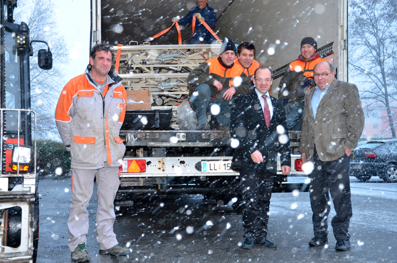 Bei der Verladung der Spitalsbetten für Albanien trotzten die freiwilligen Helfer dem winterlichen Wetter: Kaufm. Direktor Mag. Franz Huber und Dipl. KH-BW Karl Busta, stellvertretender Kaufm. Direktor vom Landesklinikum Horn (rechts)