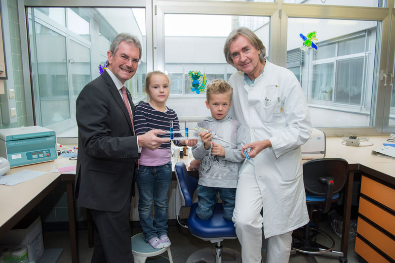 Klara Pritz und Tobias Kleemann vom Kindergarten Handel-Mazzetti-Straße St. Pölten mit Landesrat Mag. Karl Wilfing und Prim. Univ-Prof. Dr. Karl Zwiauer, Leiter der Klinischen Abteilung für Kinder- und Jugendheilkunde am Universitätsklinikum St. Pölten