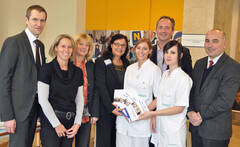 GuKPS Baden: (v.l.): Regionalmanager DI Alfred Zens, MBA, DGKS Katja Sacher, Interim. Stv. Pflegedirektorin LK Baden-Mödling, Hygienefachkraft DGKS Eveline Lechner, Direktorin Regina Lang, MBA, Schülerin Tamara Loipersbeck, Dipl. KH-BW Nikolaus Jorda, Stv. Kaufm. Direktor LK Baden-Mödling, Schülerin Cornelia Kiss, Prim. Univ.-Doz. Dr. Johann Pidlich, Ärztl. Direktor LK Baden-Mödling